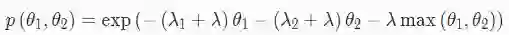 1 function y = bivexp( theta1 , theta2 ) 2 %% Returns the density of a bivariate exponential function 3 lambda1 = 0.5; % Set up some constants 4 lambda2 = 0.1; 5 lambda = 0.01; 6 maxval = 8; 7 y = exp( −(lambda1+lambda)*theta1−(lambda2+lambda)*theta2−lambda*maxval );