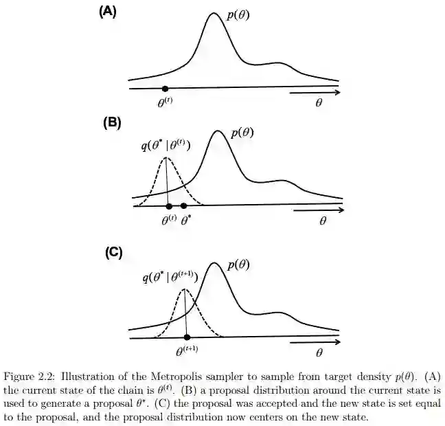 图2.2说明了两个状态序列转移的过程。为了直观地了解该过程为什么能从目标分布中获得样本,注意,如果新的建议分布得到的新状态的建议值相比旧节点状态更有可能在目标分布之下,公式(2.6)将始终接受新的建议。因此,采样器将移动到状态空间中,目标函数密度更高区域。然而,如果新的建议没有当前的状态好,仍然有可能接受这个“更糟糕”的建议并且转移到该建议状态。该过程总是接受“好的”建议,并且偶尔接受“坏的”建议,以确保采样器能探索整个状态空间,并且确保采样的样本从分布的所有部分获得(包含尾部)。