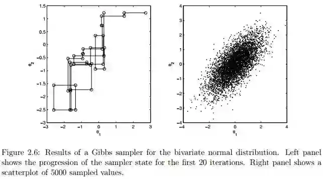 图2.6展示了利用Gibbs sampling二元正态分布的模拟结果,其中和。采样器共在一条链进行5000次迭代。右图展示了所有样本的散点图,左图模拟了前20次迭代的状态的进展。
