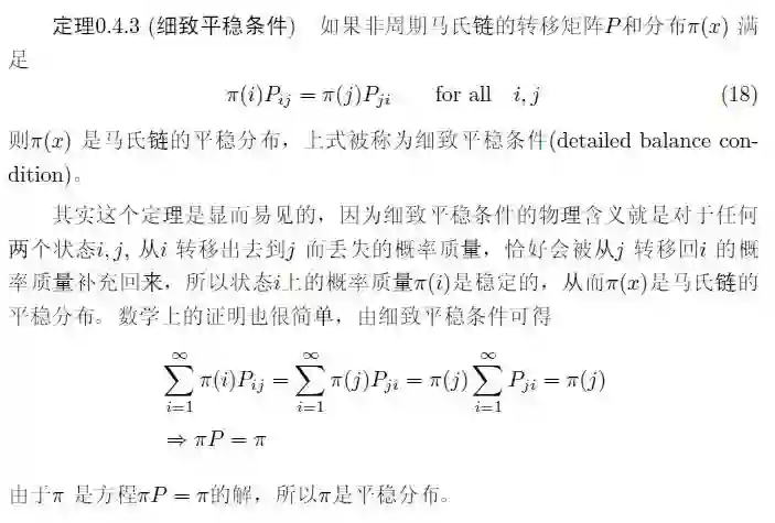 Metropolis sampler一个关键的要求是:建议分布是必须对称的,即:。因此,基于旧状态到新状态的建议概率,与从新状态返回到旧状态的建议概率是相同的,这样才能满足平稳细致方程(具体细节见:LDA数学八卦, 这里面有非常清晰说明平稳细致方程的含义,下图有个定义)。对称的建议分布有如下:正态分布(Normal),柯西分布(Cauchy),学生t分布(Student-t),以及均匀分布(uniform distributions)。如果建议分布不具有对称性,应该使用Metropolis-Hastings sampler,将在下一节讨论。