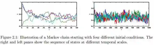 从四个不同的起始状态开始,每个链都有T=1000次迭代。图中的两个子图分别展示了不同时刻的状态序列,线的颜色代表不同的链。注意,前10次迭代显示了序列对初始状态的依赖,这是“burn-in”过程。接下来序列的剩余部分是稳定状态(如果不停止,那么继续保持稳定状态)。那么我们如何确切知道稳定状态到达的时间,又怎么知道链是收敛的呢?要解释上述问题并不是容易的,尤其是在高维状态空间中。
