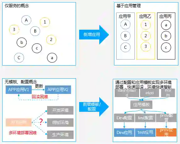 应用的多环境部署。在多个环境中,实现应用的部署,也不需要关系每个服务具体的部署信息,只需要在不同环境下修改环境对应的配置,即可以通过应用模板实现在新环境应用的快速部署。
