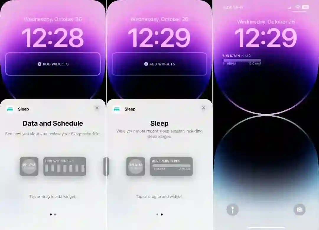 在iPhone 14 Pro和Pro Max机型上,当屏幕在常亮的显示模式下变暗时,睡眠小组件会折叠起来。