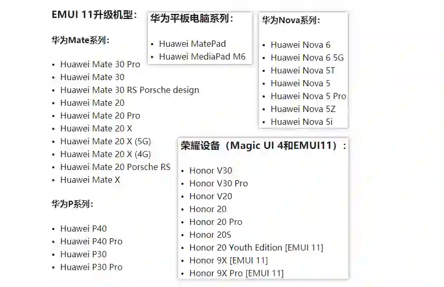 根据华为高管透露的信息,EMUI 11 会对分布式唤醒技术进行升级,着重改进智慧分屏、畅连通话等功能。按照以往的产品生命周期,预计以下产品会升级到 EMUI 11 操作系统。