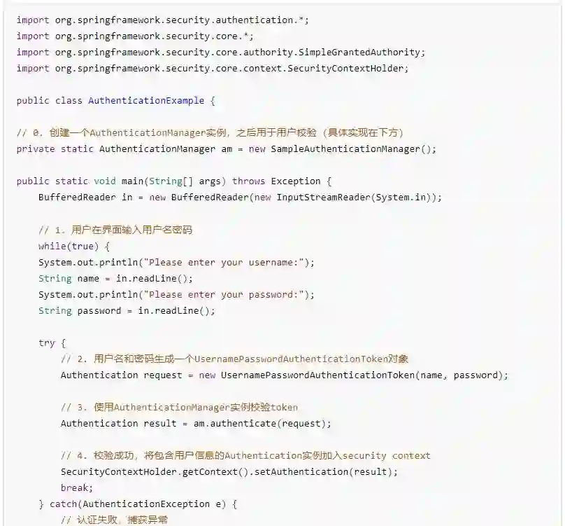 完成以上过程后,当前用户认证完成。以下代码示范了一个认证环节最基本的流程(并非SpringSecurity框架源码)