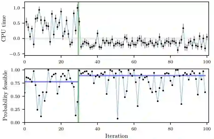 研究者使用论文中描述的方法来优化 Facebook 中的数个系统,并在论文中描述了两种优化案例。第一个案例是优化 Facebook 一个排序系统的 6 个参数。这些特定参数和索引器相关,该索引器聚集了要被发送到预测模型的内容。第二个案例是为 HHVM 优化 7 个数值编译器 flag。优化的目标是减少网页服务器的 CPU 占用,并满足不增加峰值内存占用的约束。下面这张来自论文中的图展示了每个测试配置的 CPU 占用(总共 100 个配置)随迭代次数的变化,以及每个点满足内存约束的概率。