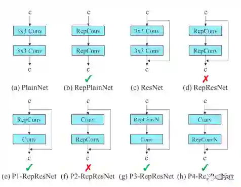 在论文研究中,作者还设计了有计划的重新参数化卷积(Planned re-parameterized convolution)。