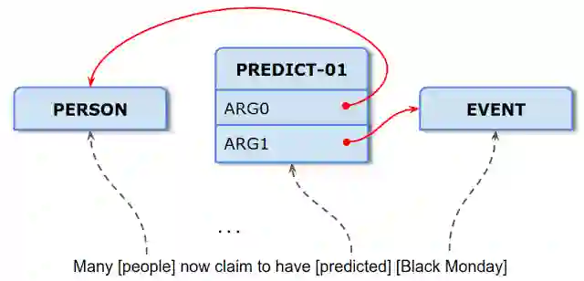 people是人物,Black Monday是事件,predicted是连接人物和事件的行为(其他概念),可单独作为一个框架元素PREDICT-01。当与人物发生相互作用时,PREDICT-01通过ARG0插槽表示“谁做的预测”,当与事件发生相互作用时,则用ARG1插槽表示“预测了什么”。整个判断过程基于语义概念结构,不会细化到针对每一个动词。
