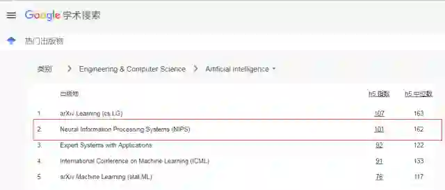 计算机学科由于成果更新迅速,更愿意通过会议优先发表成果,因此该类顶级会议大多比期刊更具权威性与影响力。NIPS和ICML是机器学习领域最受认可的两大顶会,是中国计算机学会CCF推荐的A类会议及Google学术指标前五名。(见如下)
