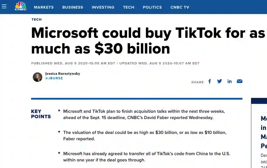 现在,我们迎来了该事件的最新进展。北京时间 8 月 6 日,据 CNBC 报道,微软计划在 9 月 15 日截止日期之前的三周内完成与 TikTok 的收购谈判,这笔交易的价值区间在 100 亿至 300 亿美元之间,即最高可能到 300 亿美元。