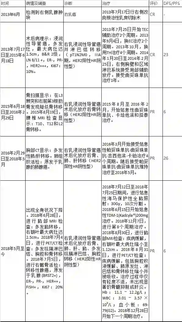 诊断:右乳浸润性导管癌术后化放疗后骨、肺、肝、脑、多发纵膈淋巴结、胸腔转移(HER2阳性HR阴性型)PFS2=26个月