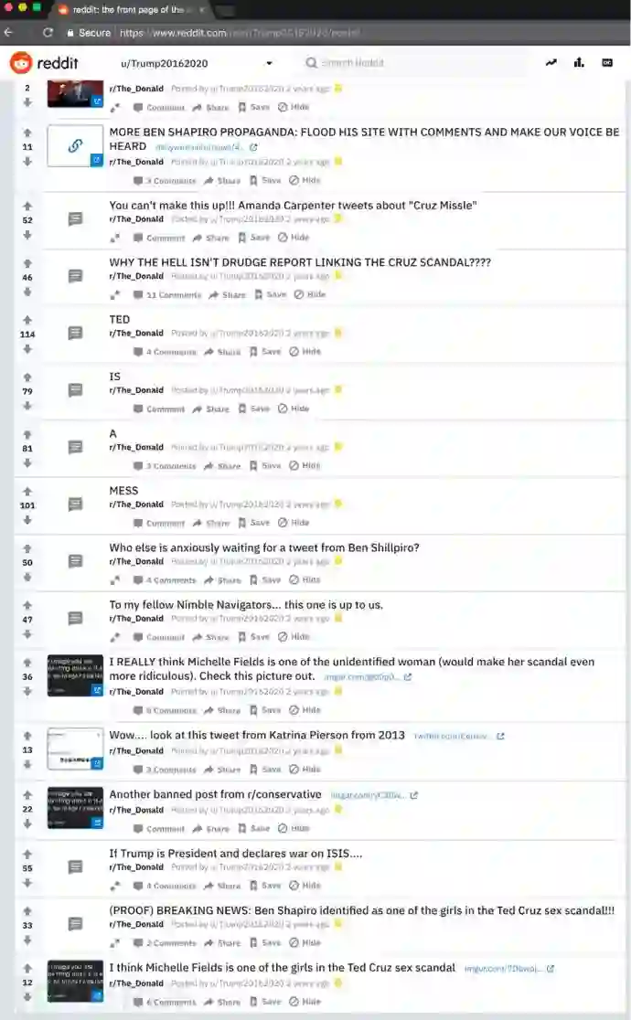 另外,在Reddit中,账号Trump20162020 还敦促特朗普追随者,利用Twitter通过#话题方式来传播特德·克鲁兹(Ted Cruz)丑闻,以帮助特朗普赢得提名。Twitter加#的话题传播方式是俄罗斯在2016年选举中传播虚假新闻的一种策略手段,特别检察官 Robert Mueller 2月份的对俄起诉中也提及了这点。