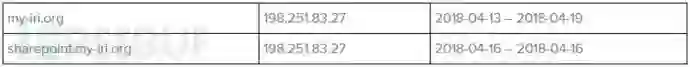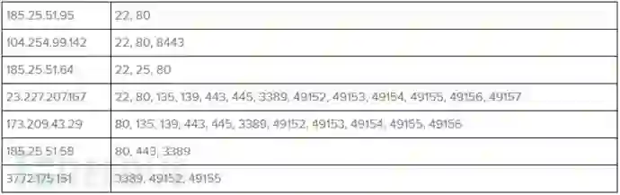 IP地址 23.227.207.167 和 173.209.43.29 有一些几乎相同的开放端口,有意思的是,它们开放的端口通常用于NetBIOS和DCOM服务,由于这些服务可以识别主机服务器可被漏洞利用的服务,因此这些端口不应曝露在互联网上。IP地址 185.25.51.64开放了SMTP的25端口,这可能是攻击者用于发送网络钓鱼相关的电子邮件。