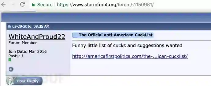 同时,我们的搜索查找还在白人民族主义者网站stormfront[.]org论坛中发现了一个americafirstpolitics[.]com的内容链接,链接标题为“The Official anti-American CuckList”。根据特别检察官 Robert Mueller 2月16日针对俄罗斯特工和俄罗斯互联网研究机构(Internet Research Agency,IRA)提交的调查起诉文件反映,俄罗斯情报机构被指示通过支持激进团体,利用社会矛盾、经济形势和反社会活动来制造网络热点,进行扩大炒作宣扬。