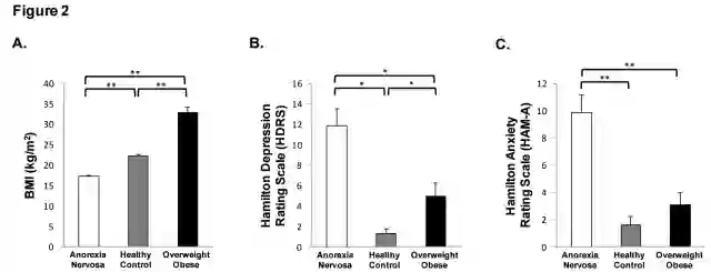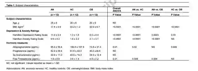 在本次研究中,研究人员一共选取了36名参与研究的女性,包括12名厌食症女性患者,她们都存在闭经的情况且她们的身体质量指数(BMI)低于18.5;12名正常体重患者,她们的BMI介于19和24之间; 12名肥胖妇女,BMI≥ 25。