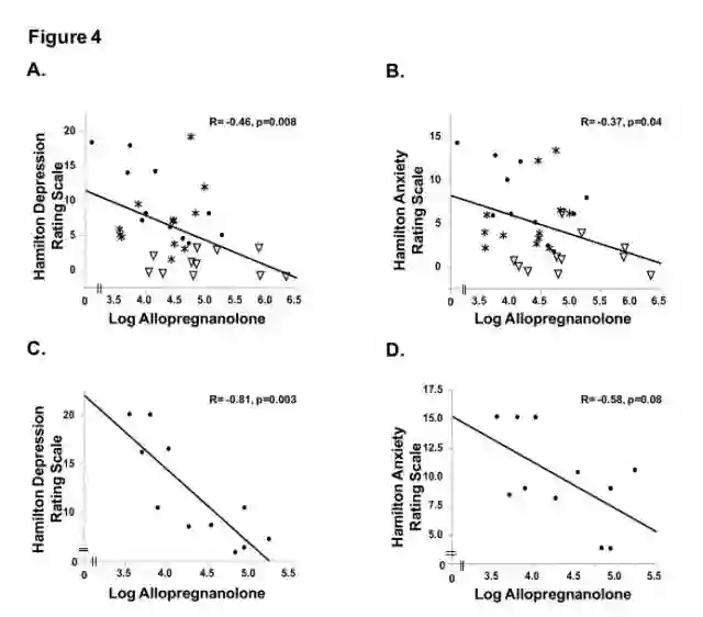 研究人员还发现,所有参与者都存在同种程度的抑郁和焦虑症状。Allo含量较低的参与者有更严重的抑郁症状。