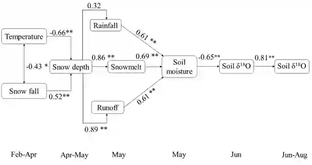 表1. 不同月份积雪融化、降雨、径流对夏季土壤水同位素的贡献比例。