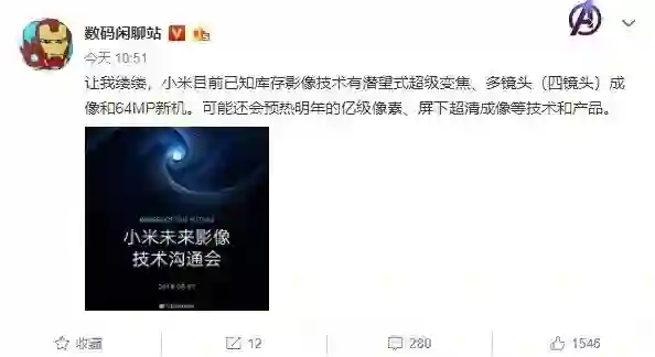 除了极有可能登场的 6400 万像素技术之外,据数码闲聊站爆料,小米还有可能带来潜望式超级变焦,以及预热明年的亿级像素、屏下超清成像等技术和产品。