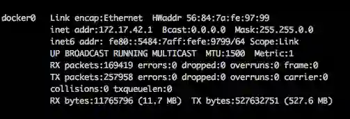 在宿主机上执行ifconfig,会看到docker0这个网络接口, 启动一个container,再次执行ifconfig, 会有一个类似veth****的interface,每个container的缺省路由是宿主机上docker0的ip,在container中执行netstat -r可以看到如下图所示内容: