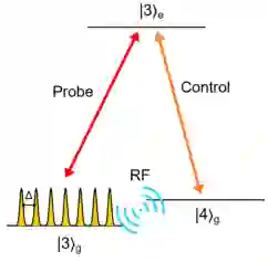 存储方案示意图,信号光场(probe)被梳状的原子吸收谱吸收,并被控制光场(control)存储为自旋激发,在射频(RF)场的操控下延长存储时间,最终读取为光信号。