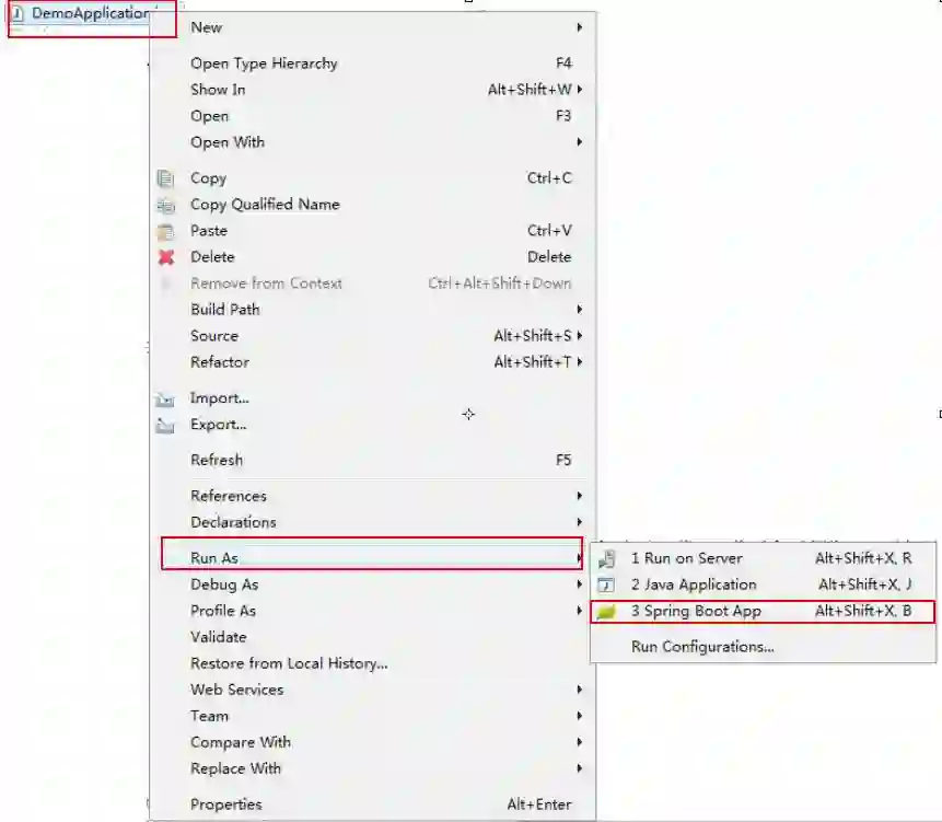 右键点击DemoApplication.java ——》Run As ——》Spring Boot App启动程序
