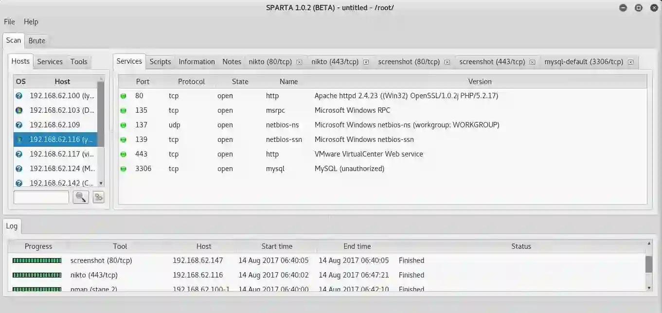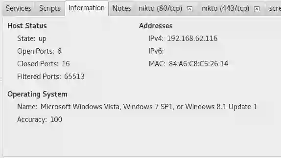 稍等一会,等待下面窗口中的扫描状态全为Finished,就说明全部扫描完毕,通过下面的扫描状态栏,我们可以看到扫描用到了nmap和nikto工具进行自动化扫描