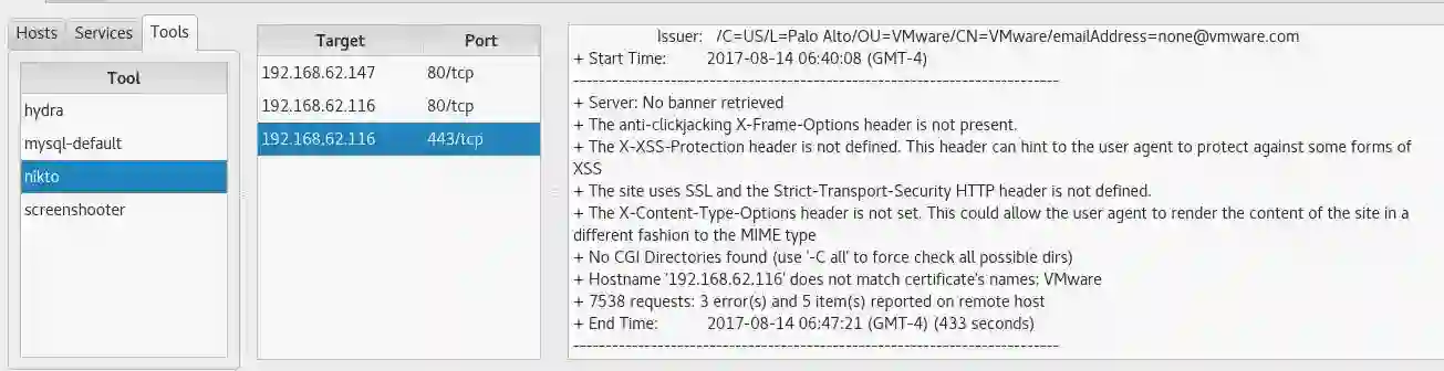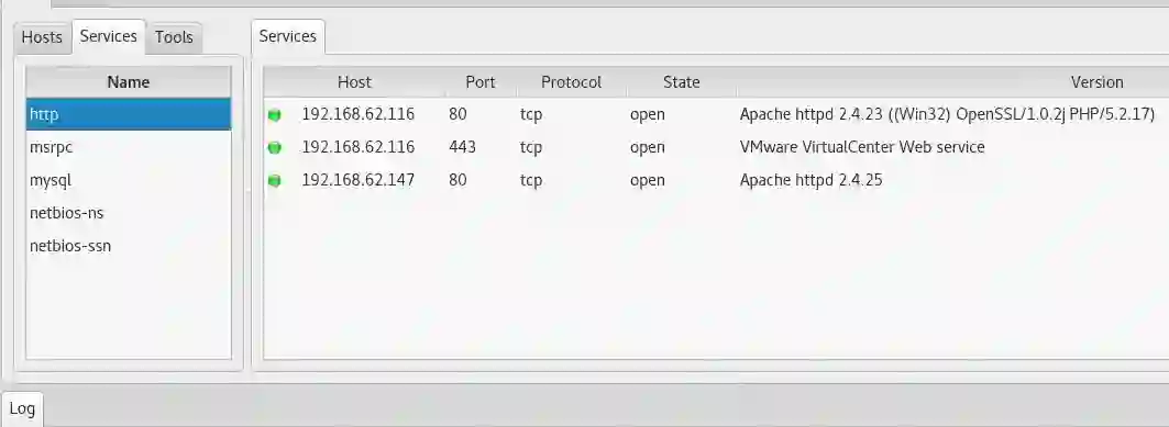 扫描完,我们就可以翻看一下查找需要的信息或者有没有我们可以利用的漏洞,这里我们可以点击左边的按钮,查看被某项工具扫描的主机,或者有某项服务的主机,都是特别直观