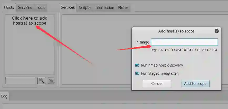 然后我们找到工具左面的hosts,然后点击空白处,就跳出了一个窗口,在这个窗口里我们可以设置扫描的主机段,然后这里作为演示我填了我所在的内网段,然户点击Add to Scope就开始扫描了