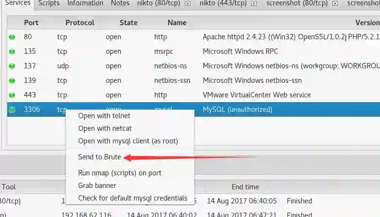 然后我这里发现了一个主机的敏感端口,然后就可以右键点击这个端口,来进行连接或者爆破