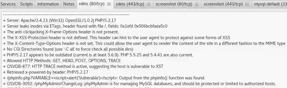 然后我们还可以看,nitko对各个开放端口的扫描结果,有什么漏洞,或者安全隐患