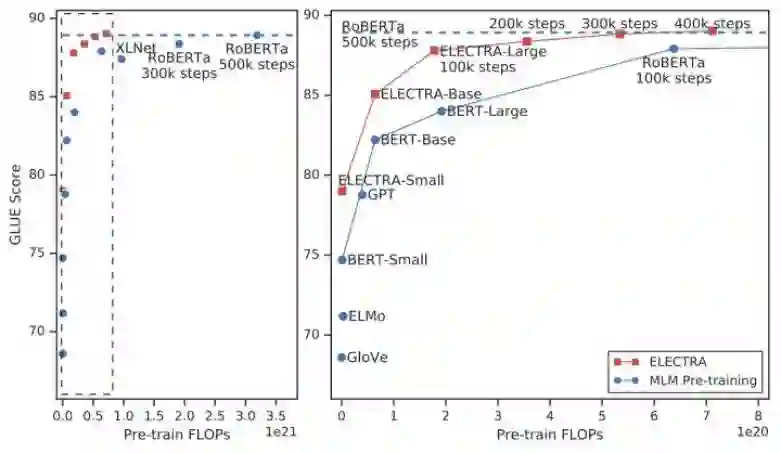 ELECTRA 通过类似 GAN 的结构和新的预训练任务,在更少的参数量和数据下,不仅吊打 BERT,而且仅用 1/4 的算力就达到了当时 SOTA 模型 RoBERTa 的效果。