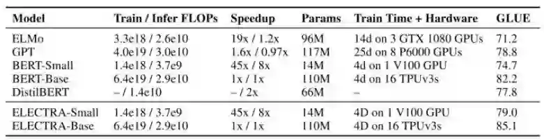 这两节真是吊打之前的模型,作者重申了他的主要目的是提升预训练效率,于是做了 GPU 单卡就可以愉快训练的 ELECTRA-Small 和 BERT-Small,接着和尺寸不变的 ELMo、GPT 等进行对比,结果如下: