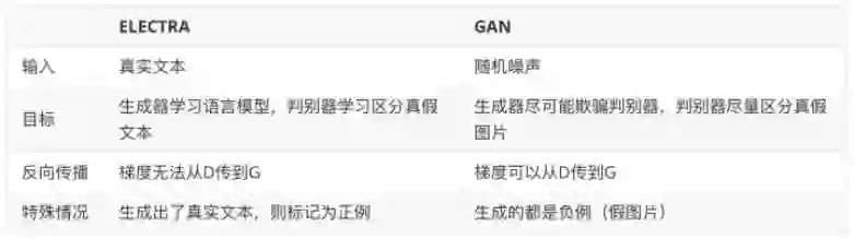 事实上,ELECTRA 使用的 Generator-Discriminator 架构与 GAN 还是有不少差别,作者列出了如下几点: