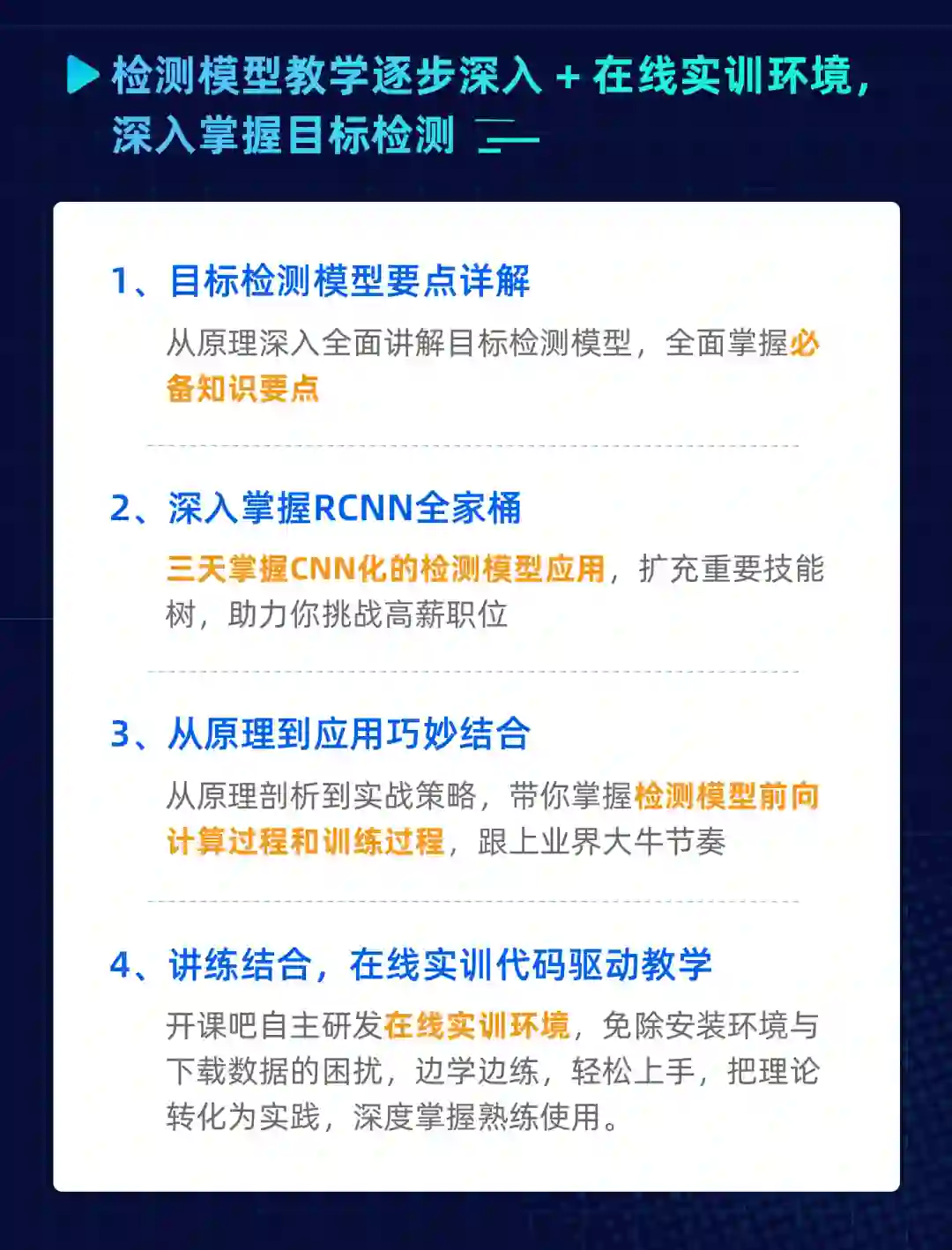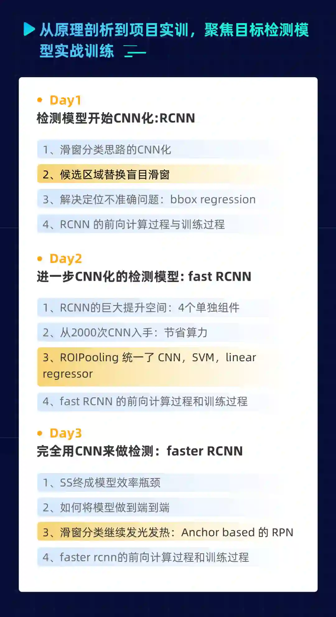 3天掌握RCNN全家桶,从检测模型教学逐步深入,配合在线实训环境,更可以深入掌握目标检测: