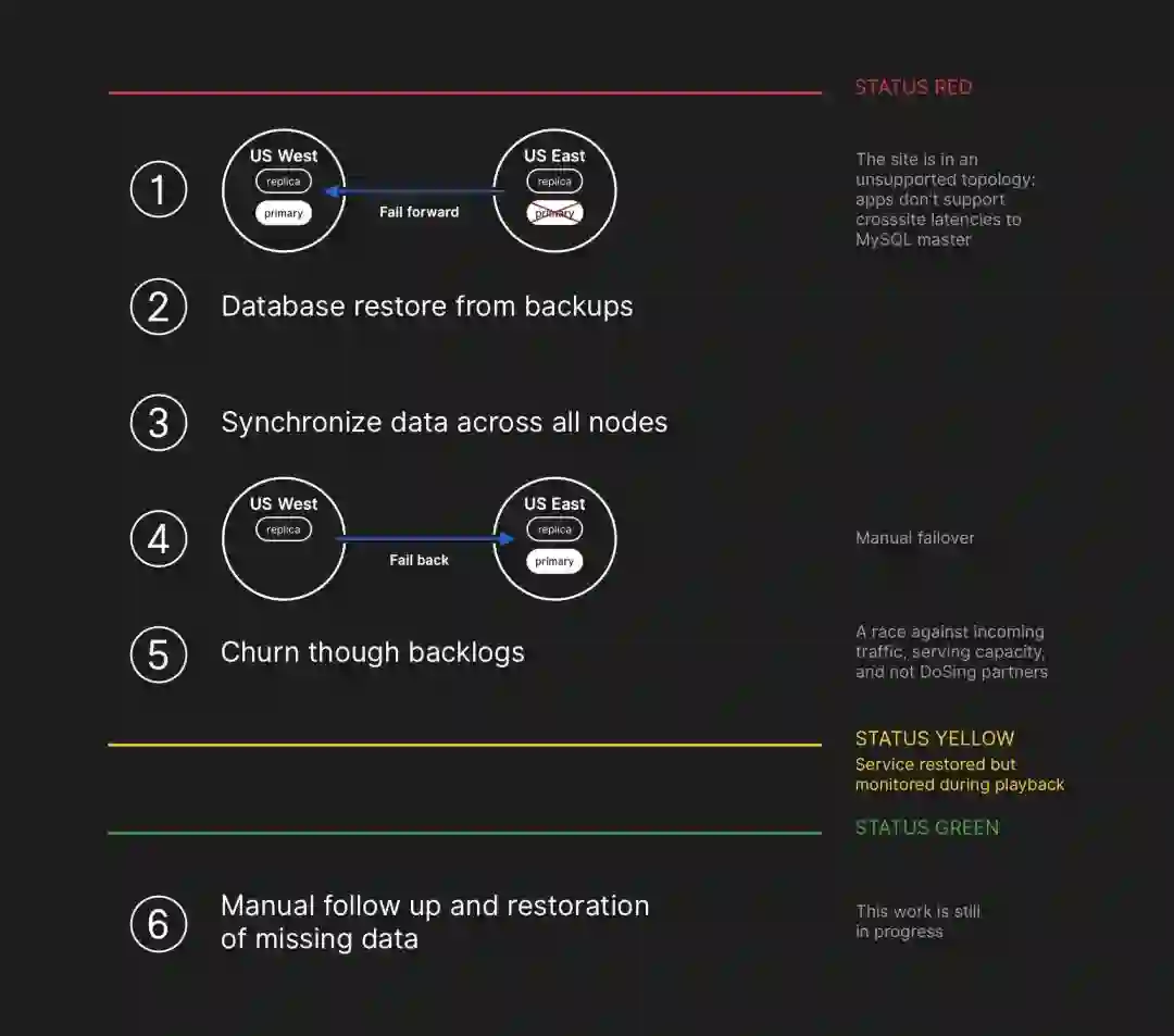 事故响应团队的工程师开始制定解决数据不一致问题的方案,并实现 MySQL 故障转移。我们的计划是从还原进行备份,同步两个站点的副本,回退到稳定的服务拓扑,然后继续处理排队的作业。我们更新了状态,告诉用户我们将要执行一次内部数据存储系统的可控故障转移。