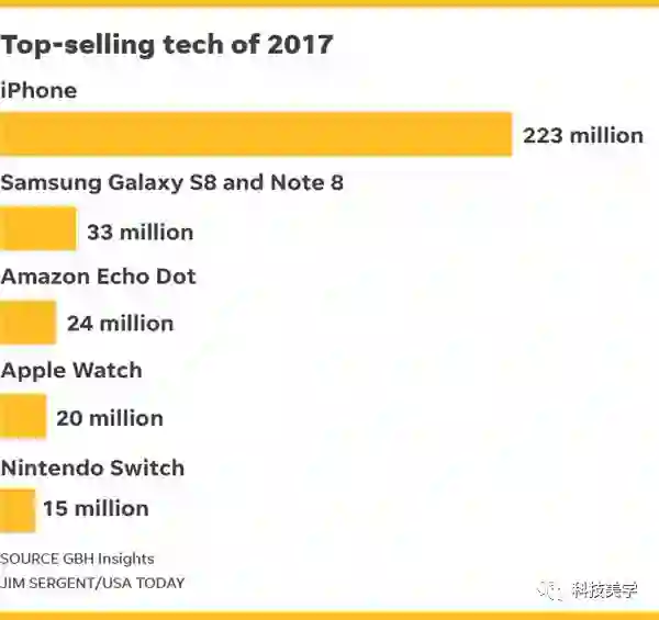 从这份报告中可以看出,第一名是iPhone,而这个iPhone包含了目前在售的多个型号,而销量也是衡量一款产品是否成功的一个重要尺度,榜单中的iPhone,今年一年销量将达到2.23亿台。