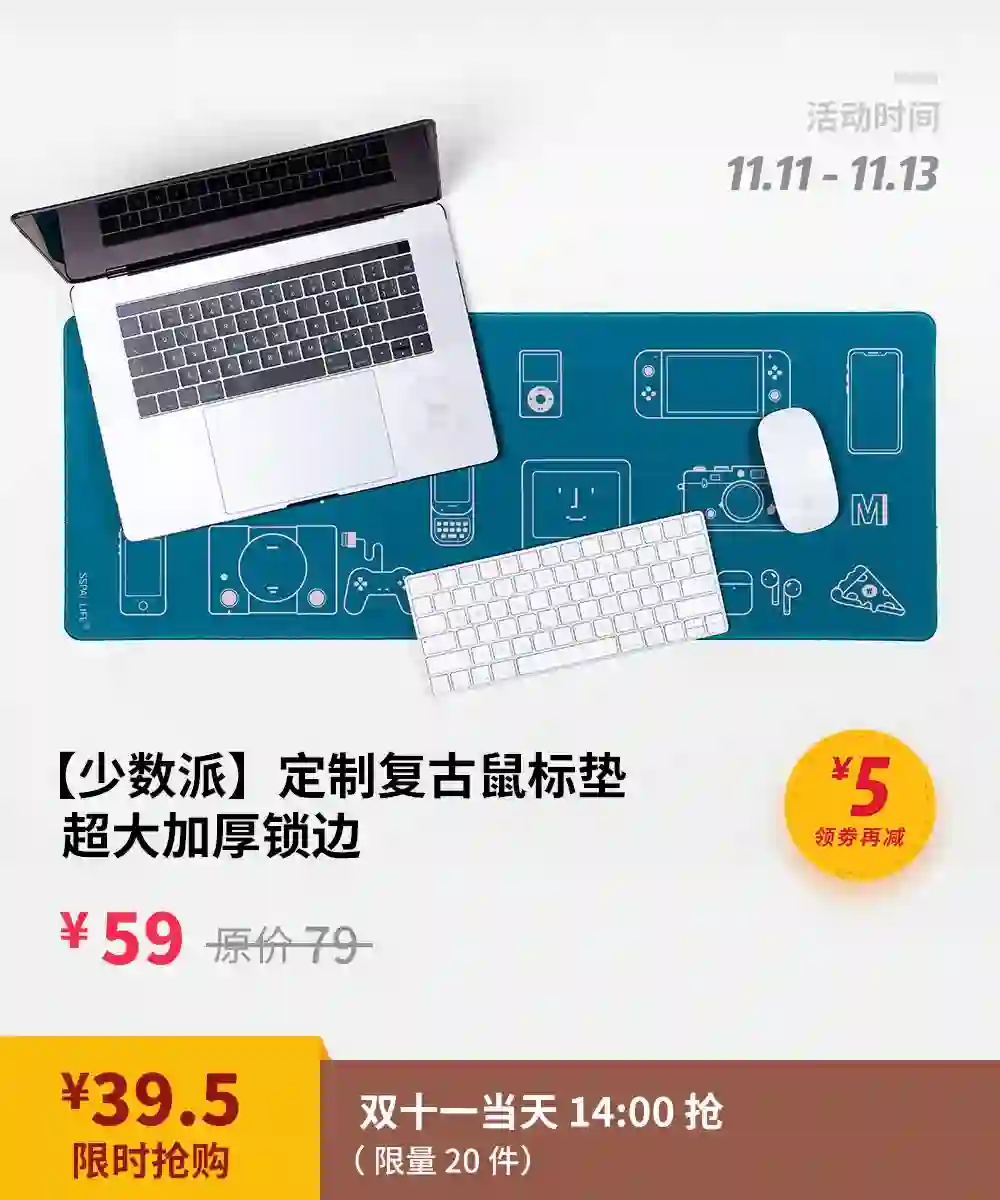 又到一年一度双十一,也是少数派商店开店以来的第一个双十一。为了感谢大家对少数派周边的支持,双十一期间,全店商品都将无套路减价、更有无门槛优惠券、满 1000 减 50 等……