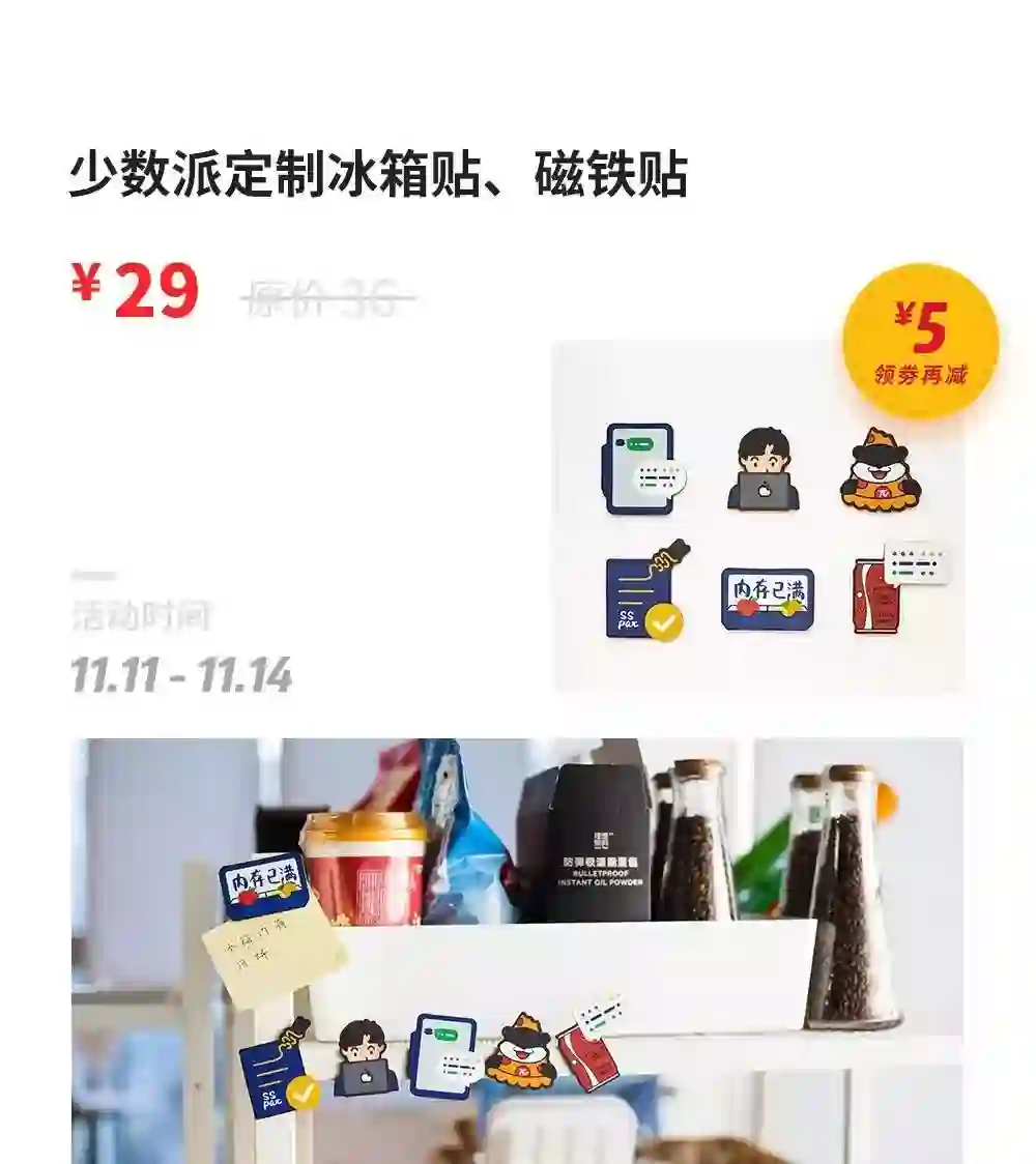 设计元素选用了既生活方式又保持一贯少数派效率。选用磁铁材质,可以用在多个场景:热爱生活的你可以贴在冰箱上、热爱工作的你可以贴在会议室黑板上……