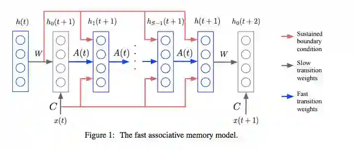 For each connection in our network, the total weight is the sum of the results from both the slow and fast weights. The hidden state for each time step for each input is determined by the operations with the slow and fast weights. We use a fast memory weights matrix A to alter the hidden states to keep track of the features required for any associative learning tasks.