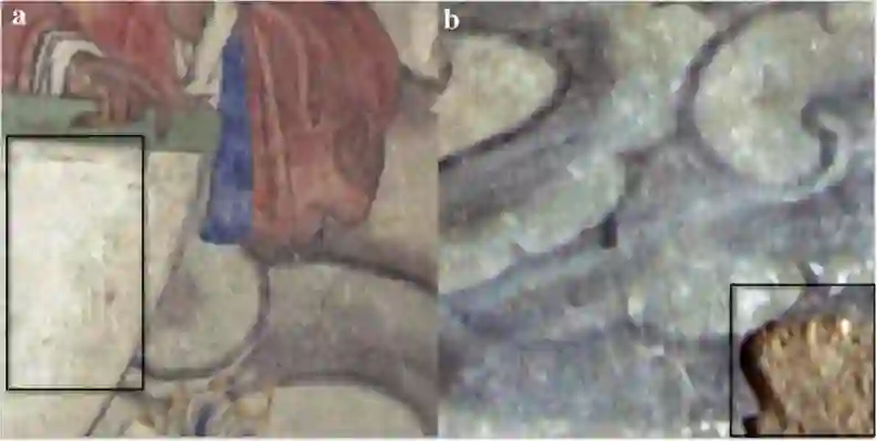 图:古代庙宇壁画剥落样例 a.漆层剥落 b.土层剥落