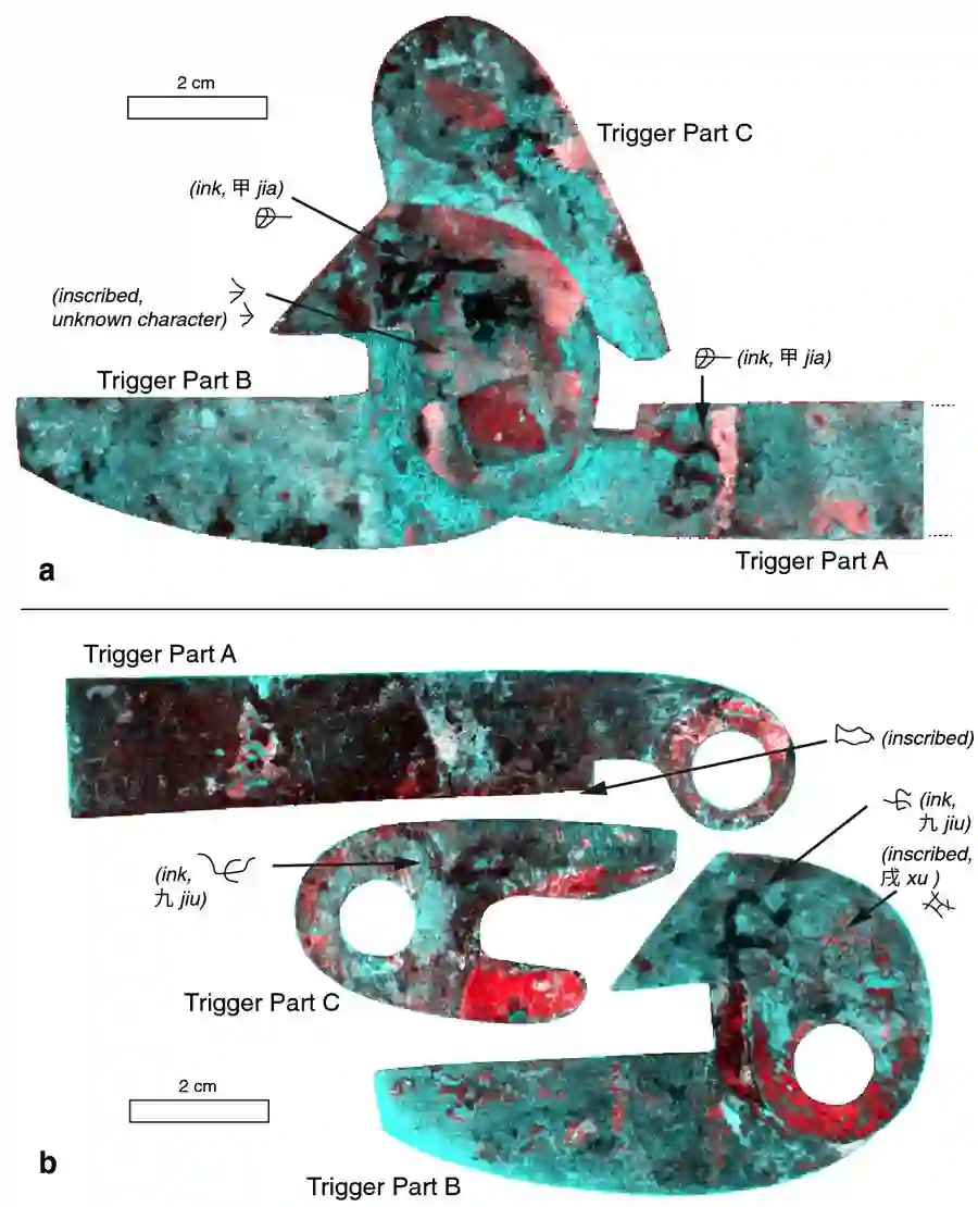 战国时代和华夏文明早期,官僚实践的核心工作是一项定期的小型会计工作,即通过标记物件和人员,来对他们进行行径追踪、质量检验和数量编列。秦始皇(公元前259-210年)墓群中,兵马俑的青铜武器上印有非常知名的长幅文字和短幅刻印,这些信息能帮助我们从多方面了解华夏民族成型关键时期的工艺组织和物流形式。发表在Heritage Science的Ink marks, bronze crossbows and their implications for the Qin Terracotta Army文章研究了从秦兵马俑1号坑中青铜弩扳机上的两个鲜为人知的墨水铭文展开,通过多光谱摄影、数字显微镜和拉曼分析,研究者在这两个扳机上发现了更多具有和雕刻标记相似的“匹配”标记的印记。同时,该研究识别出制作标记的黑色物质为烟灰墨。对墨印和雕刻的扳机标记开展的空间分析,也为研究秦代青铜制作者如何进行这些标记活动提供了的更多信息。