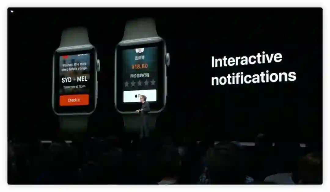 watch OS 5 在 Siri 表盘也增加了一些功能,比如刚才在 iOS 12 中介绍的 Shotcuts。watchOS 5 的通知界面也变得更加具有可操作性和交互性,加入了第三方应用的支持,并支持 Siri 的多任务操作,可通过通知直接进行显示二维码、支付等操作。它还加入了 WebKit,不需要网络浏览器,但是如果恰好点击了链接,也可以看到网页内容。