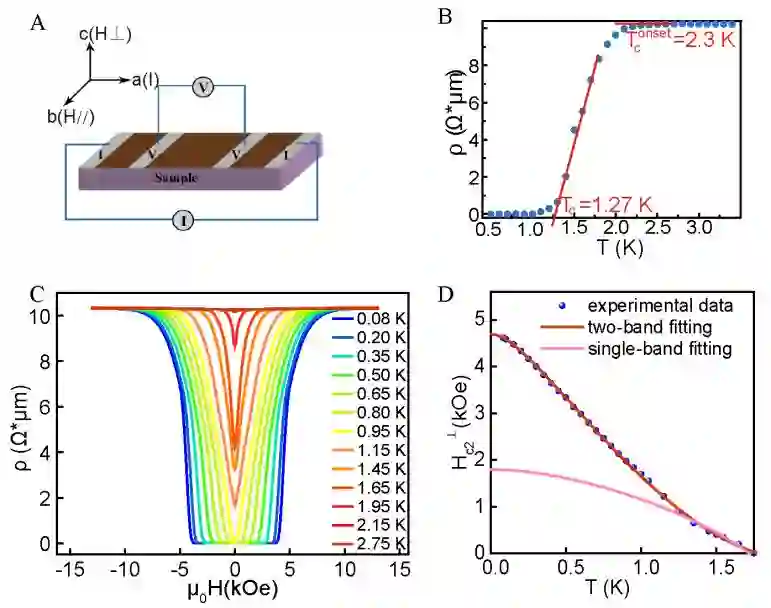 图一. 电磁输运实验观测到的s+- 超导的证据,揭示拓扑超导的可能性。 (A) 电磁输运实验的测量示意图。 (B) 超导转变温度附近的电阻率-温度关系。(C) 各个温度和磁场下的电阻率。(D) 超导上临界磁场和温度的关系。红色的线是两带超导模型的拟合曲线,拟合结果发现带间耦合比较大,表明该超导行为是s+- 超导。