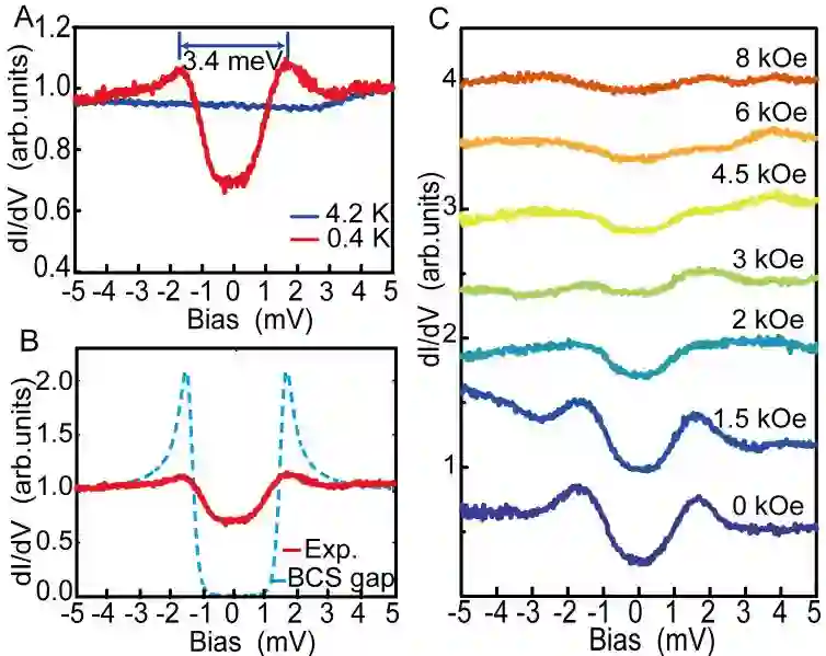 图二.扫描隧道显微镜观发现表面态的超导能隙远超过体态的超导能隙,揭示出拓扑超导的可能性。(A) 4 K和0.4 K下样品表面的微分电导dI/dV谱。在0.4 K下,超导能隙是1.7meV,远大于体态的超导能隙,且能隙与临界温度的比值约为约为8.6,远大于常规超导材料的能隙与临界温度的比值(1.76)。4 K时样品处于非超导态。(B) 0.4 K超导dI/dV谱和各向同性BCS超导谱的对比。(C) 0.4 K时,不同磁场下的超导dI/dV谱,超导能隙被外加磁场所抑制。