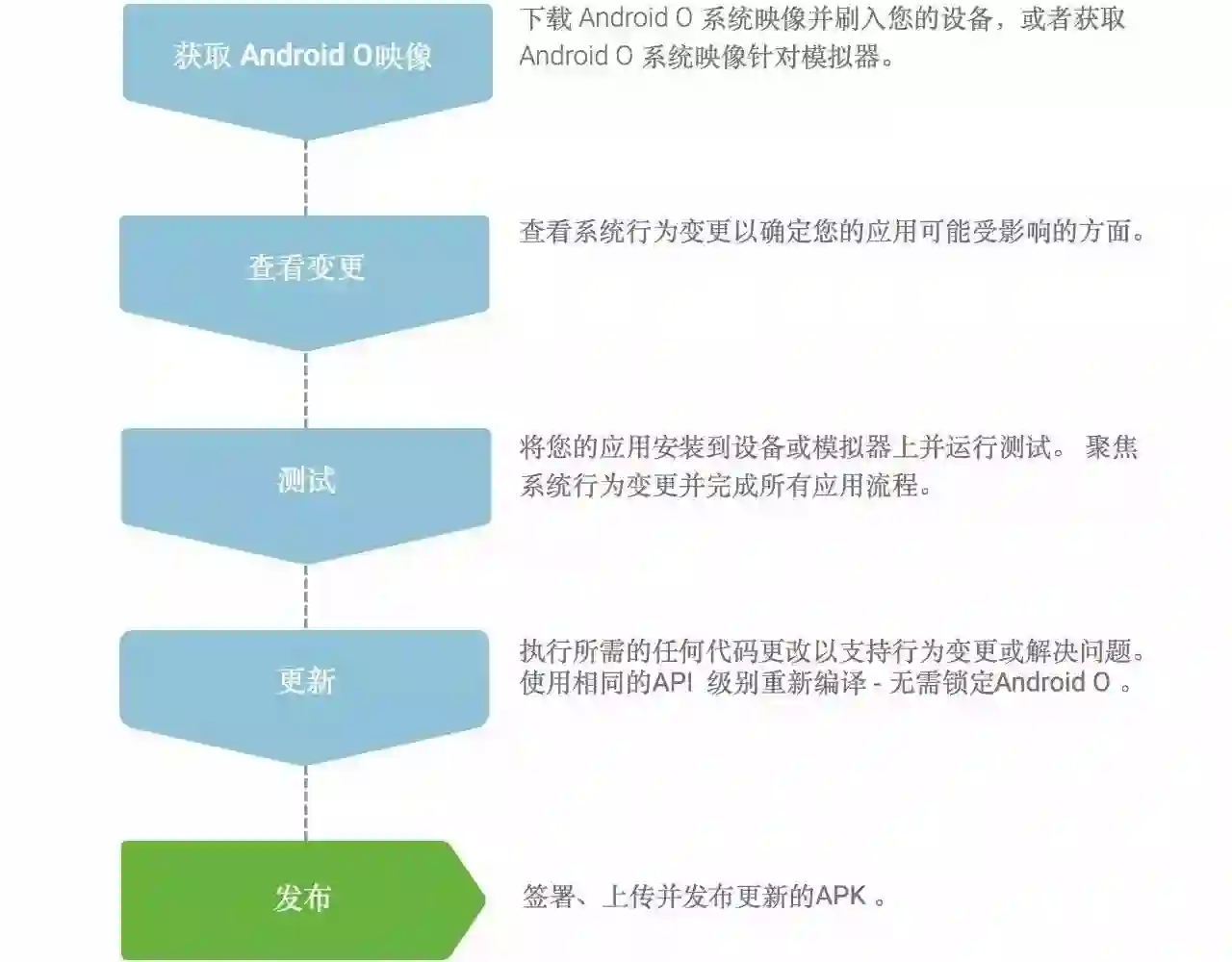 这一步的目标是确保应用在 Android O 上可照常运行。由于一些平台变化可能影响应用的行为方式,因此可能需要进行一些调整,但您不需要使用新的 API 或更改 targetSdkVersion。