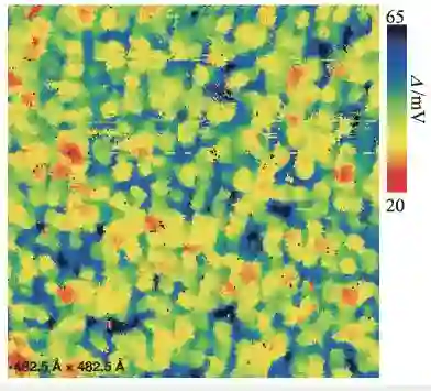 电子态的奇怪行为或许并不是最烧脑的,仔细看超导能隙的分布,其实也是非常不均匀的!也就是说,如果直接观测铜氧化物高温超导体中的能隙,就会发现在不同区域的能隙数值是有所不同的。有的区域能隙大,有的区域能隙小,形成了一团团的能隙簇(图7)。这种现象在常规超导体中几乎绝不可能出现,因为对于它们而言,同一块超导材料中的超导能隙,有且只有一个。BCS 超导理论告诉我们,超导能隙的大小是决定临界温度高低的关键因素之一。原则上,能隙越大,破坏超导态所需要的能量就越高,超导临界温度也就越高。所以在常规超导理论中,超导能隙通常和临界温度有一个固定的比例系数。但在高温超导体中,如此分布不均匀的能隙,是否意味着超导临界温度也是分布不均的呢?倘若如此,如果那些高能隙的区域没有连接到一起,又如何实现高临界温度呢?即使实现了高临界温度,如此杂乱的超导状态又如何能够稳定存在呢?这些问题的答案扑朔迷离。