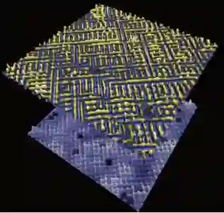 进一步,如果用精细的扫描探针观测电子态本身的分布,也同样能够看到许多非常不可思议的状态。如果把电子态在不同能量尺度做一张“指纹地形图”的话,在特定的能量尺度下,看到的电子态是一条条“沟壑”,或高或低,或长或短,比老奶奶脸上的皱纹还复杂(图6)。把电子态和原子的周期结构做比较,有时会发现局域范围内呈现4 倍原子结构周期的电子态,这种电子态如果两边都是4 倍原子周期,就会形成如同国际象棋黑白方格一样的“电子棋盘格子”,所谓“棋盘电子态”。棋盘电子态主要存在于100 meV 之下的低能段,是低能电子组态。如果检查高能段电子态,还会发现电子的出现概率似乎远比掺杂输入的电子数要大得多,体现了掺杂莫特绝缘体的特征。