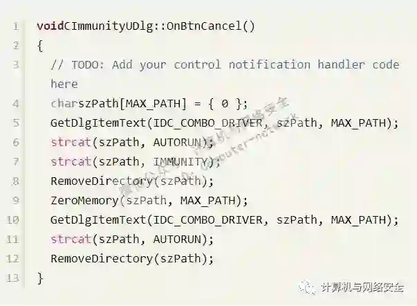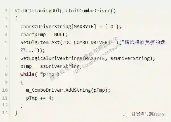 我们进行免疫时是对某个分区进行免疫的,因此要在ComboBox控件中显示出所有的磁盘分区供用户选择。在ComboBox中显示所有的磁盘分区,我们定义成一个函数来完成该功能。