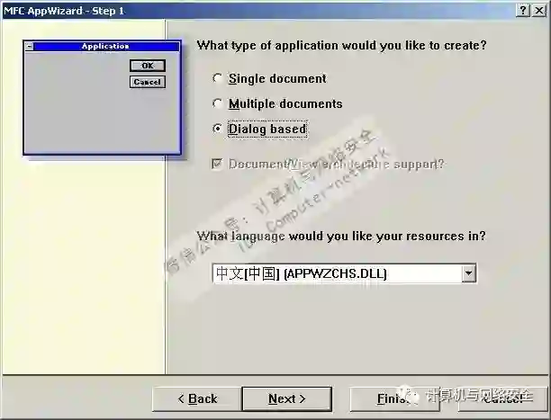 单击“OK”按钮后,出现“MFC App Wizard–Step 1”的界面,选择“Dialog based”单选钮,如图2所示。