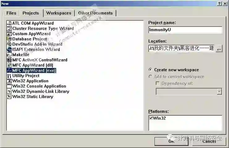 启动VC6,选择菜单“File”->“New”命令,在弹出的“New”对话框中选择“Projects”选项卡,在左侧的列表中选择“MFC App Wizard(exe)”,在右侧填写项目的名称“ImmunityU”,如图1所示。